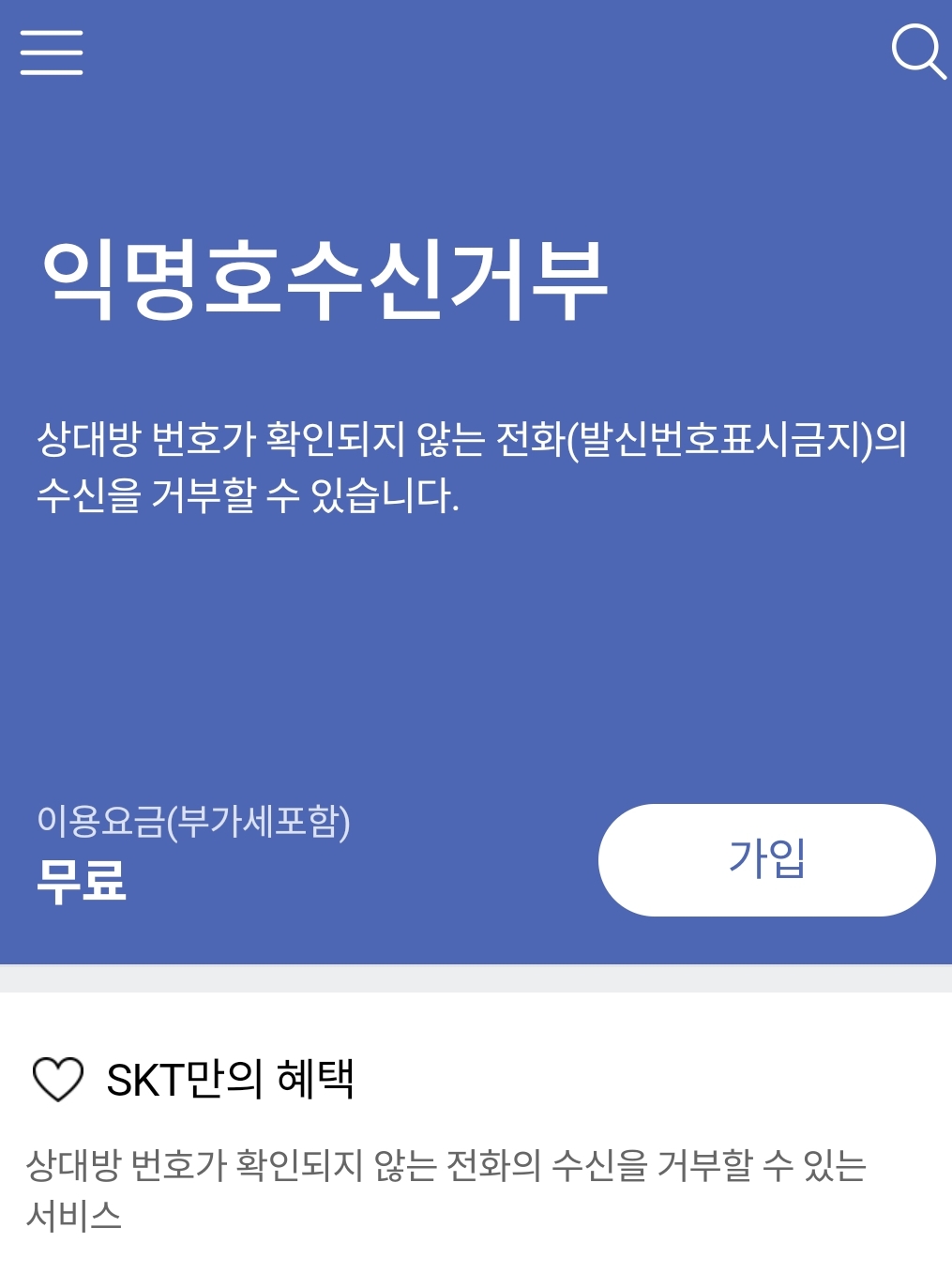 이 서비스를 가입하면 상대방 번호가 확인되지 않는 전화들 있잖아요. 발신번호표시금지 전화들의 수신을 자동으로 거부해줍니다. 이용요금? 없어요! 무료입니다. 그저 클릭 3번만 해주면 바로 가입되는 서비스입니다.