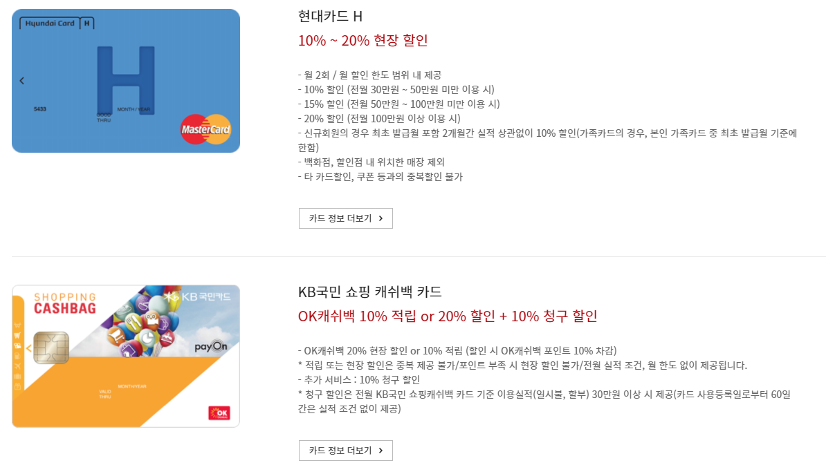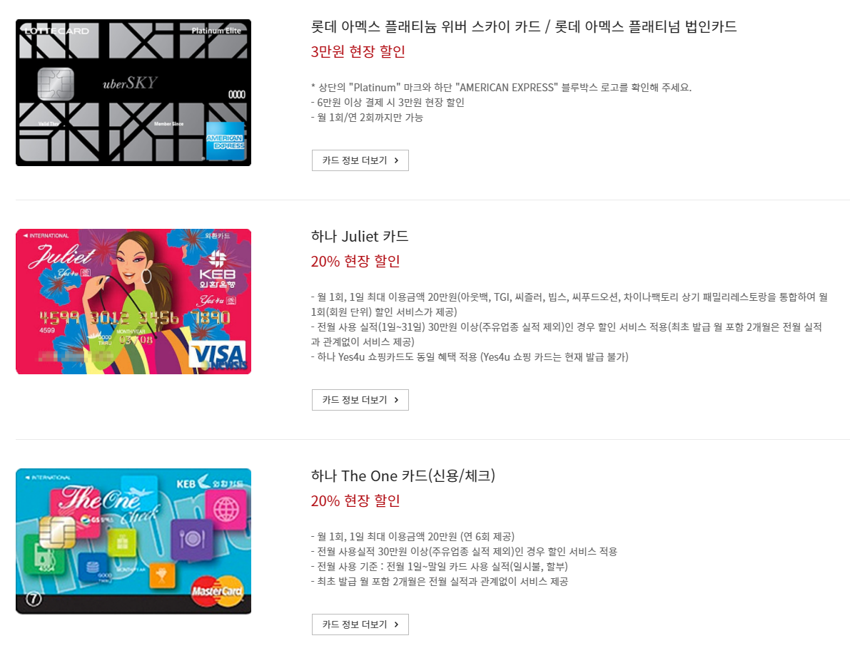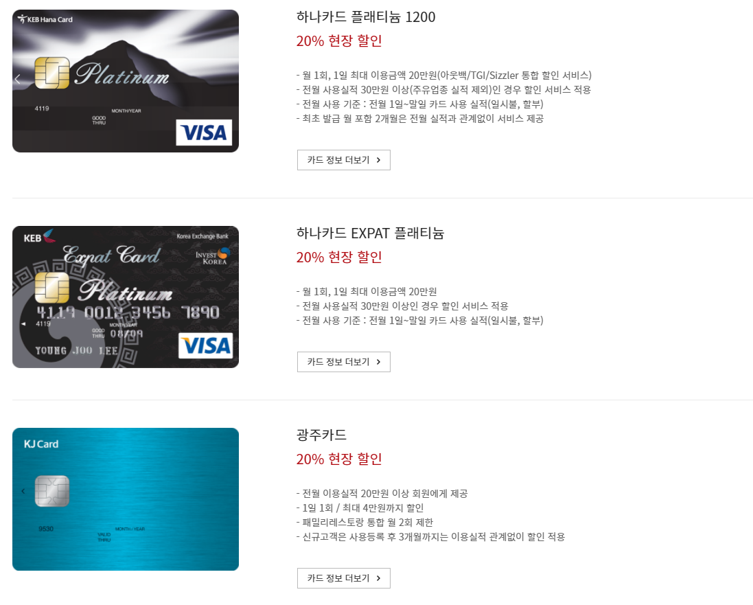 하나카드 플래티늄 1200과 하나카드 EXPAT 플래티늄, 광주카드 모두 20% 현장 할인이구요. 보통 1회 최대 4만까지 할인되는 혜자 카드들이예요.