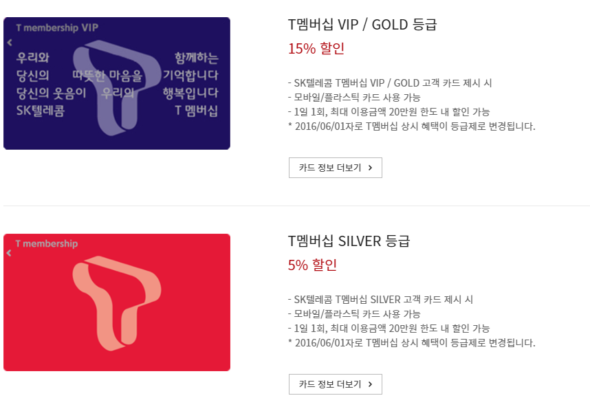 T멤버십 VIP나 gold 등급일 경우 15% 할인이 되거든요. 최대 20만원한도내로 가능하다고 하니 엄청 큰 혜택이예요.