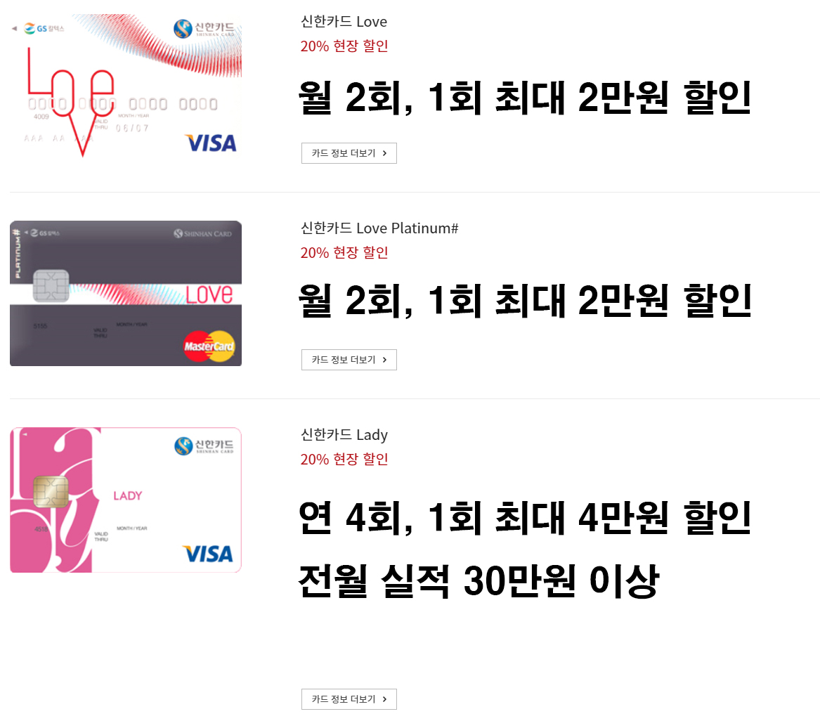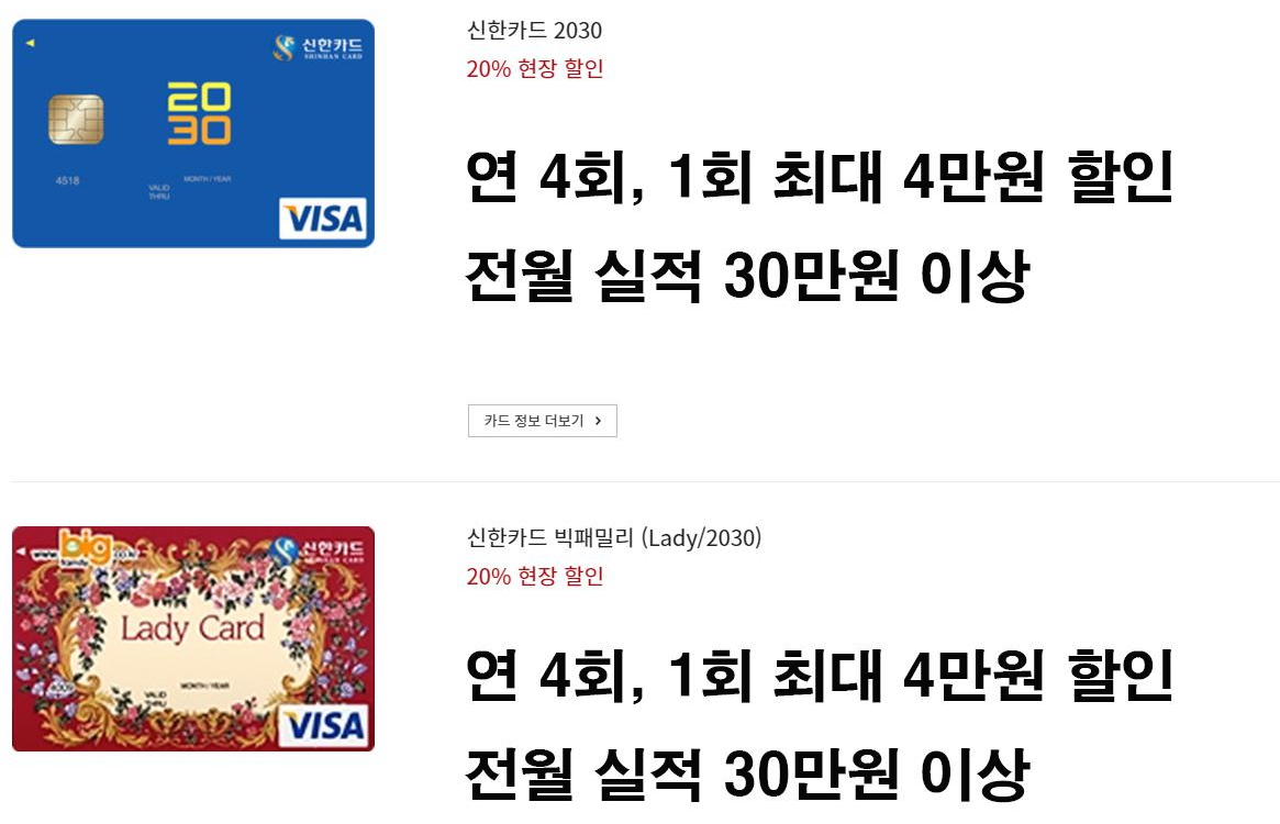 신한 카드에는 LOVE 와 러브 플래티넘, 레이디 카드들이 있는데요. 대부분 현장 20% 할인이구요. 최대 2만원까지 할인입니다. 다만 신한카드 레이디의 경우는 20만원 사용분까지 할인이 돼서 최대 4만원 할인받을 수 있구요. 연 4회까지 가능합니다.