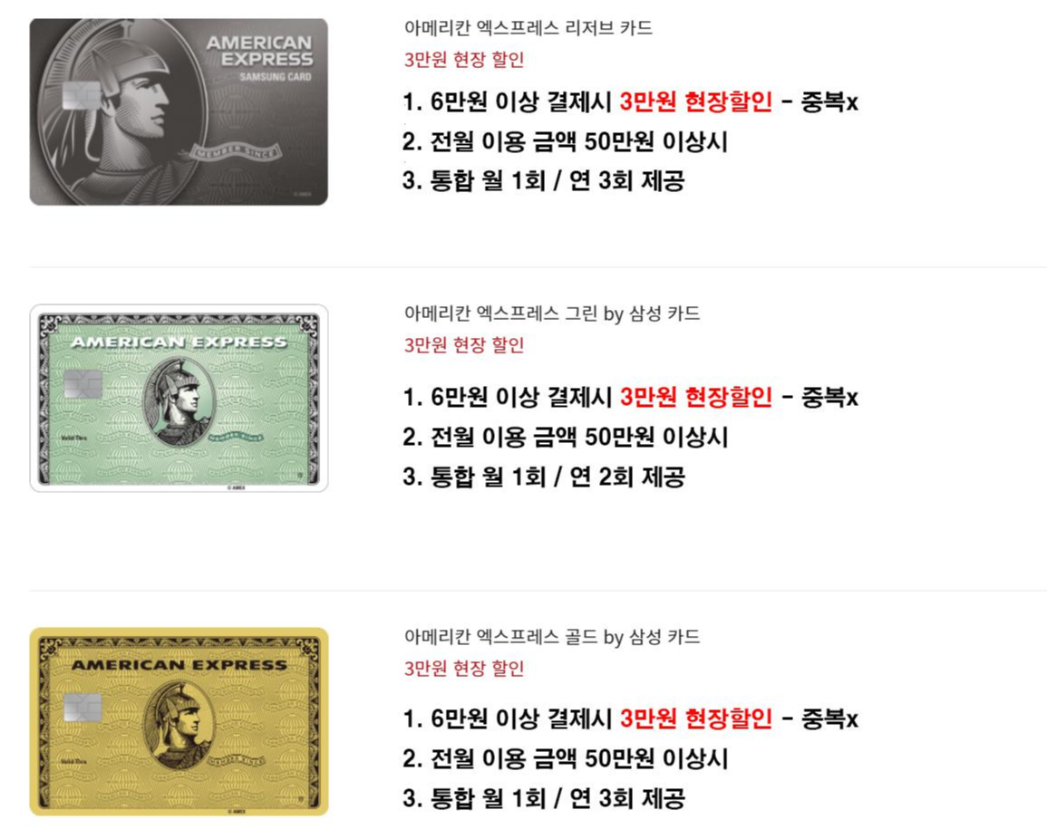 삼성 엑스프레스 카드는 6만원 이상 결제시 3만원 현장할인입니다. 현장할인 뜻은 그 자리에서 바로 할인해준다는 뜻으로, 다른 할인들과 중복이 안돼요. 통신사 할인도 현장할인이거든요. 다만 할인폭이 진짜커!