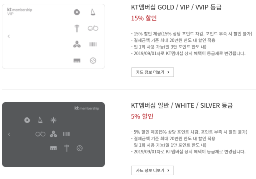 혹은 KT멤버십 골드나 VIP, VVIP 회원을 찾으셔도 좋습니다. 현장에서 15% 할인해주거든요. 일 1회 가능하구요. 결제금액 최대 20만원까지 적용입니다.