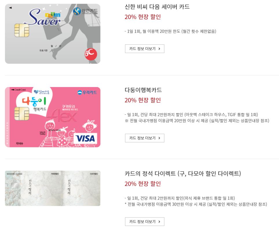 비씨 다음 세이버 카드는 20% 현장할인이고, 월 최대 4만원까지만 할인돼요. 한달에 1번 아웃백 이용하면 많은 할인을 받을 수 있겠구요.