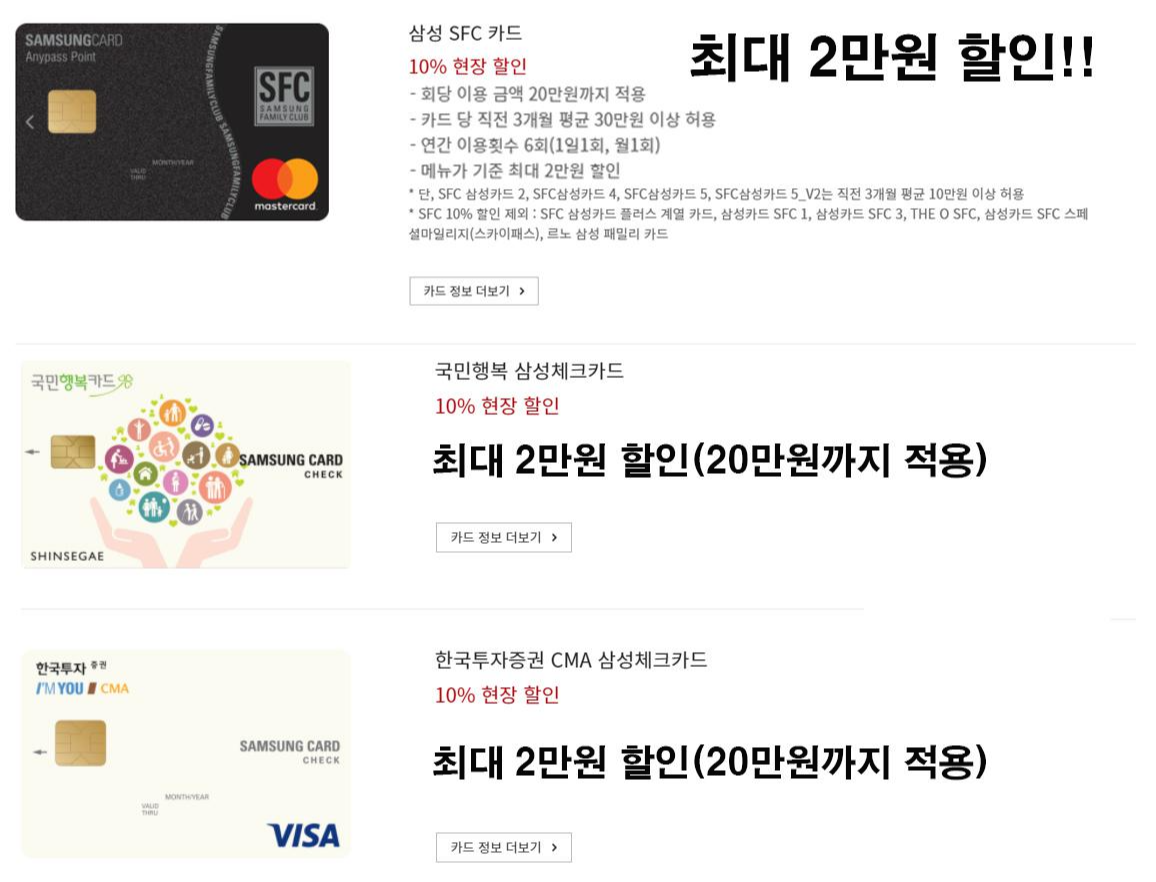 나머지 삼성카드들, SFC 삼성 임직원 카드나 국민행복 삼성체크카드, 한국투자증권 CMA 삼성체크카드들은 10%할인이구요. 최대 2만원까지만 할인받을 수 있습니다. 10%면 최저 할인이자 평균할인 정도예요.