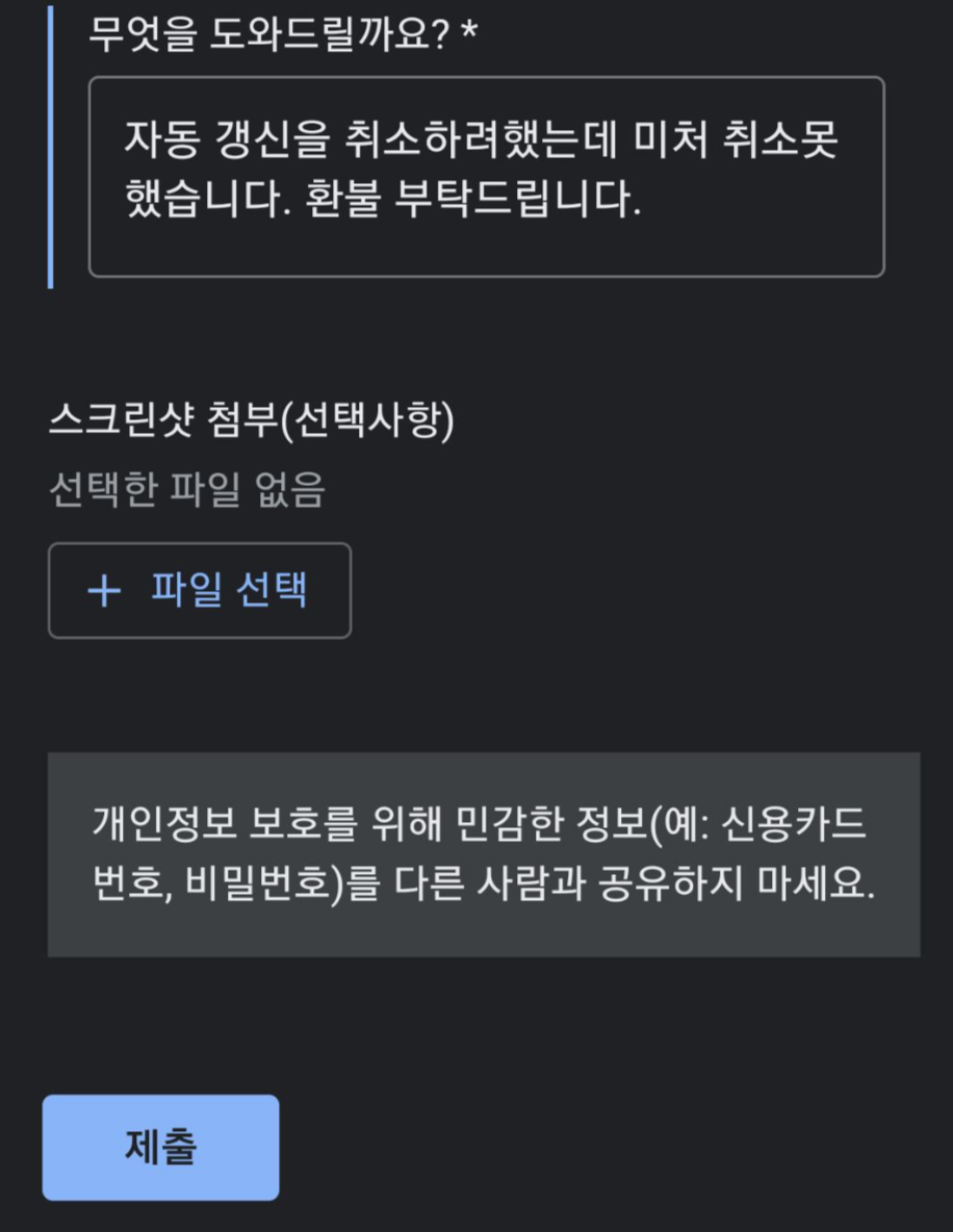 무엇을 도와드릴까요라는 질문에 '환불하고 싶습니다' 선택하시구요. 아래 쪽에는 서술형 기입란이 있습니다. 여기에는 대충 자동결제일인걸 까먹고 유튜브 프리미엄 갱신 취소를 못했다. 전액 환불 부탁드린다 정도로 기입하면 돼요. 저도 대충 적었어요.
