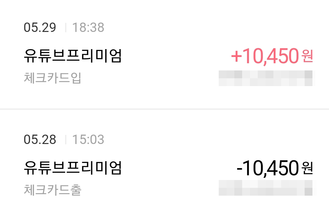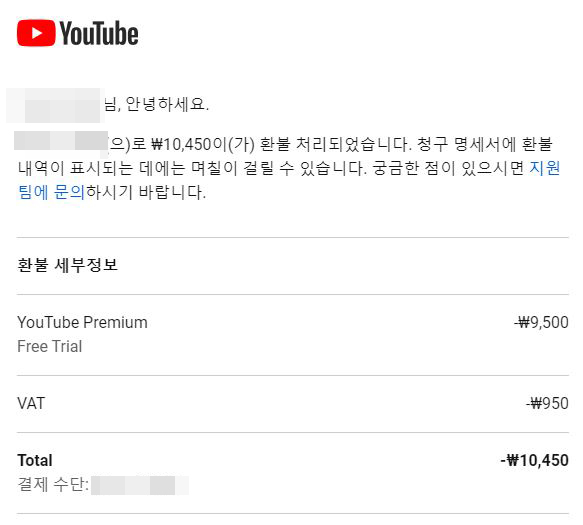 저도 5월 28일 15시 3분에 빠졌던 10450원 유튜브 프리미엄 자동결제가 5월 29일 18시 38분에 바로 환불조치됐어요. 하루 정도 유튜브 프리미엄 더 사용했는데, 그거 상관없이 바로 환불해주더라구요. 솔직히 구글한테 환불 받는거 되게 어려울 줄 알았는데 환불 바로 해줘서 너무 기분이 좋네요 ㅎㅎ