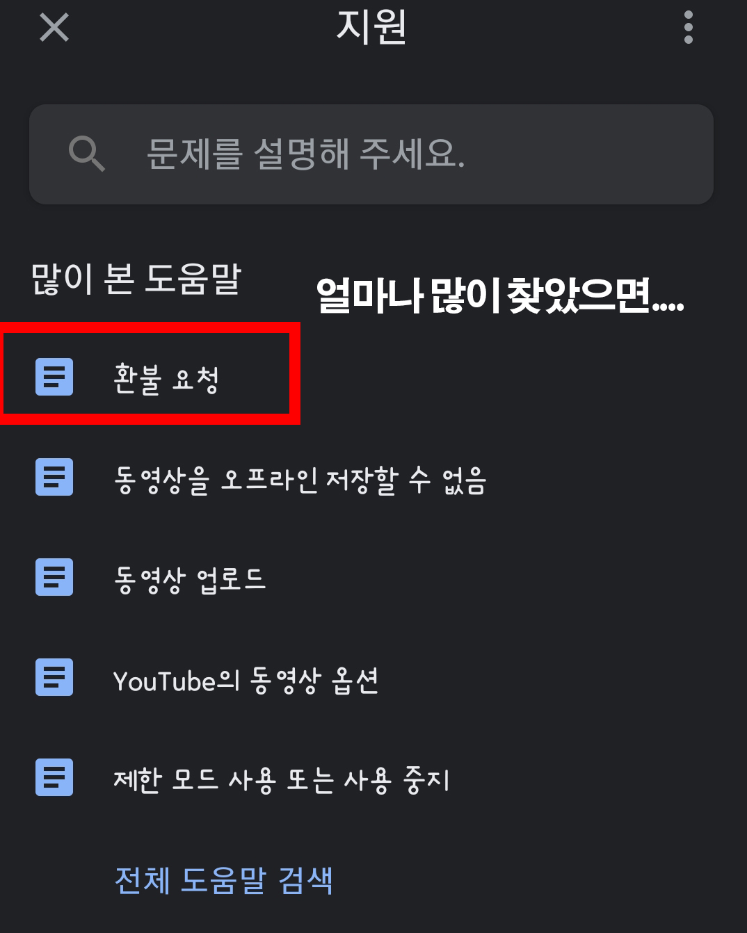 제일 위에 많이 본 도움말이 있는데, 얼마나 자동결제로 피해를 입었으면 환불 요청이 1순위겠어요 ㅎㅎㅎ환불 요청을 클릭해줍니다.