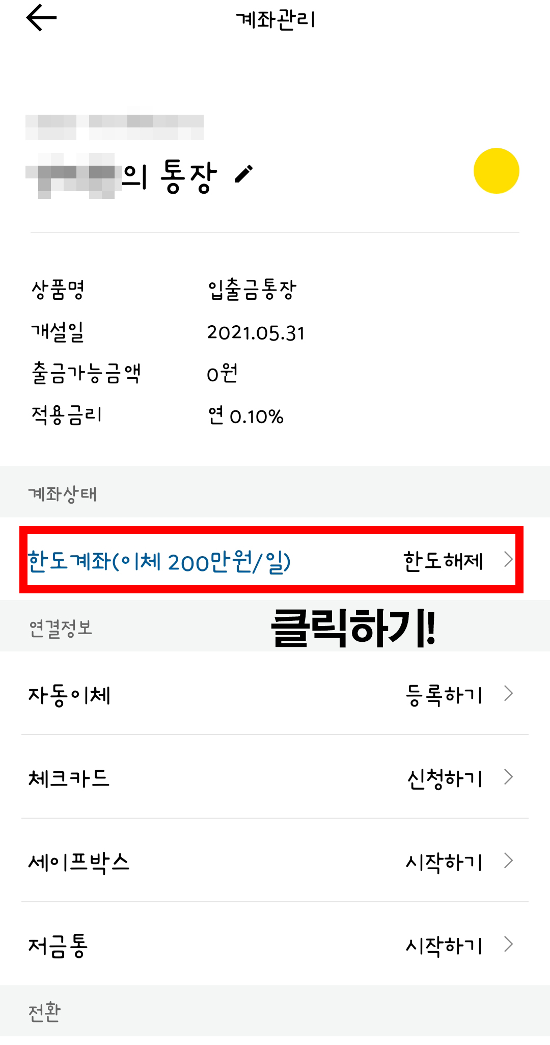 계좌 관리 창으로 들어가지는데요. 여기서 계좌 상태를 보면 한도계좌(이체 200만원/일)이 적혀있죠. 한도해제 버튼을 눌러줍니다. 일 200만원으로는 이제 날 만족시키지 못해.