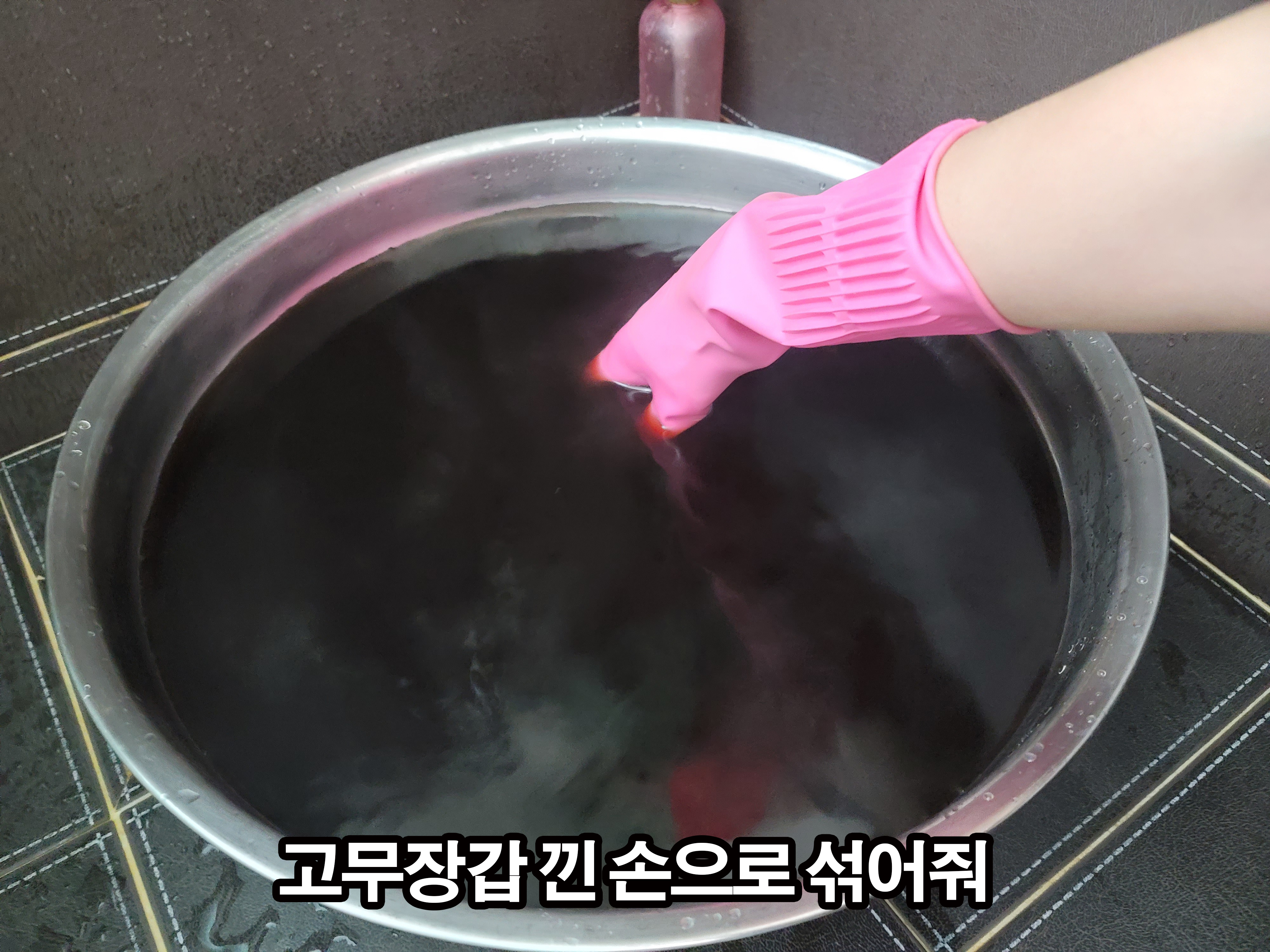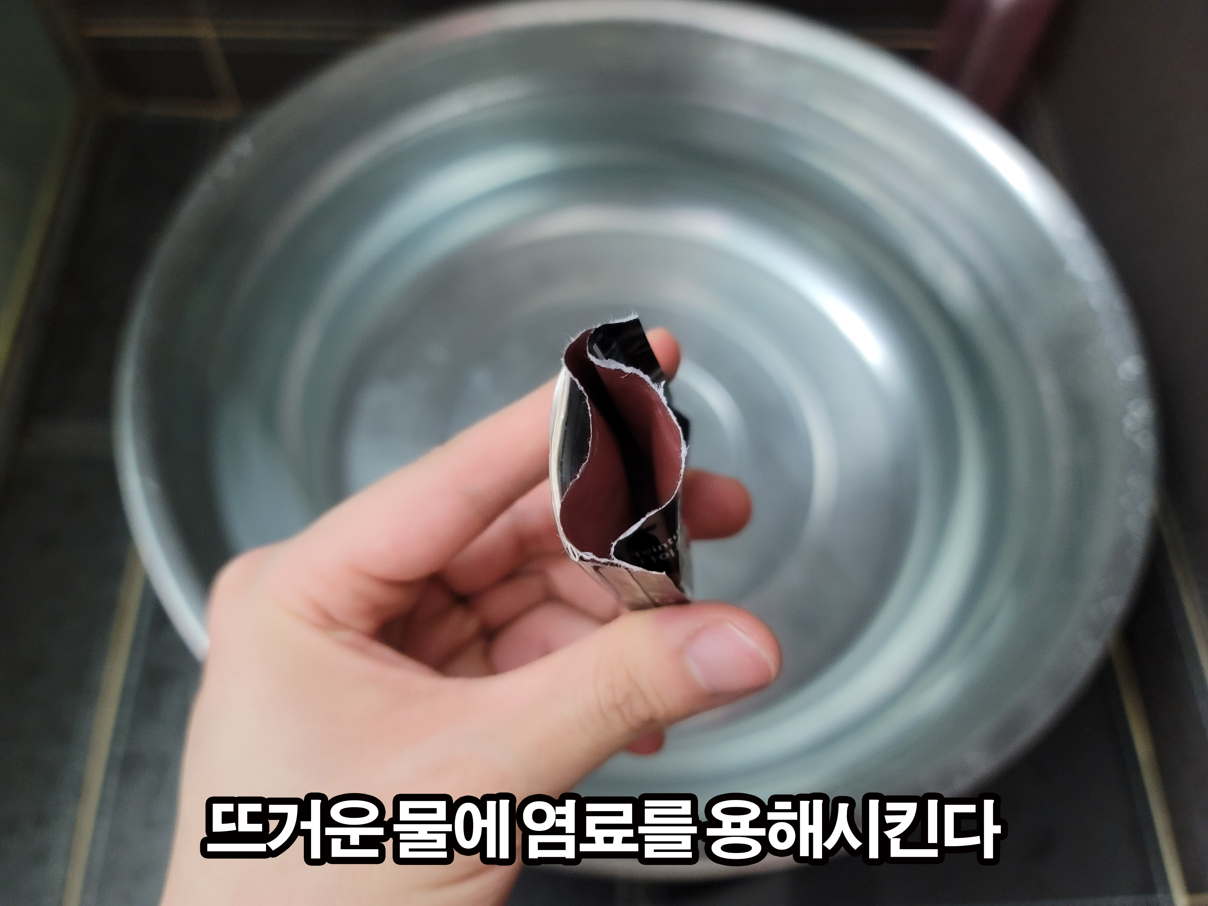 소금이 다 녹았으면 이 물을 염색약이 녹아있는 대야에 부어줍니다. 그 다음 손으로 열심히 휘저으면서 소금이랑 염색약이랑 잘 섞이게 해주세요.