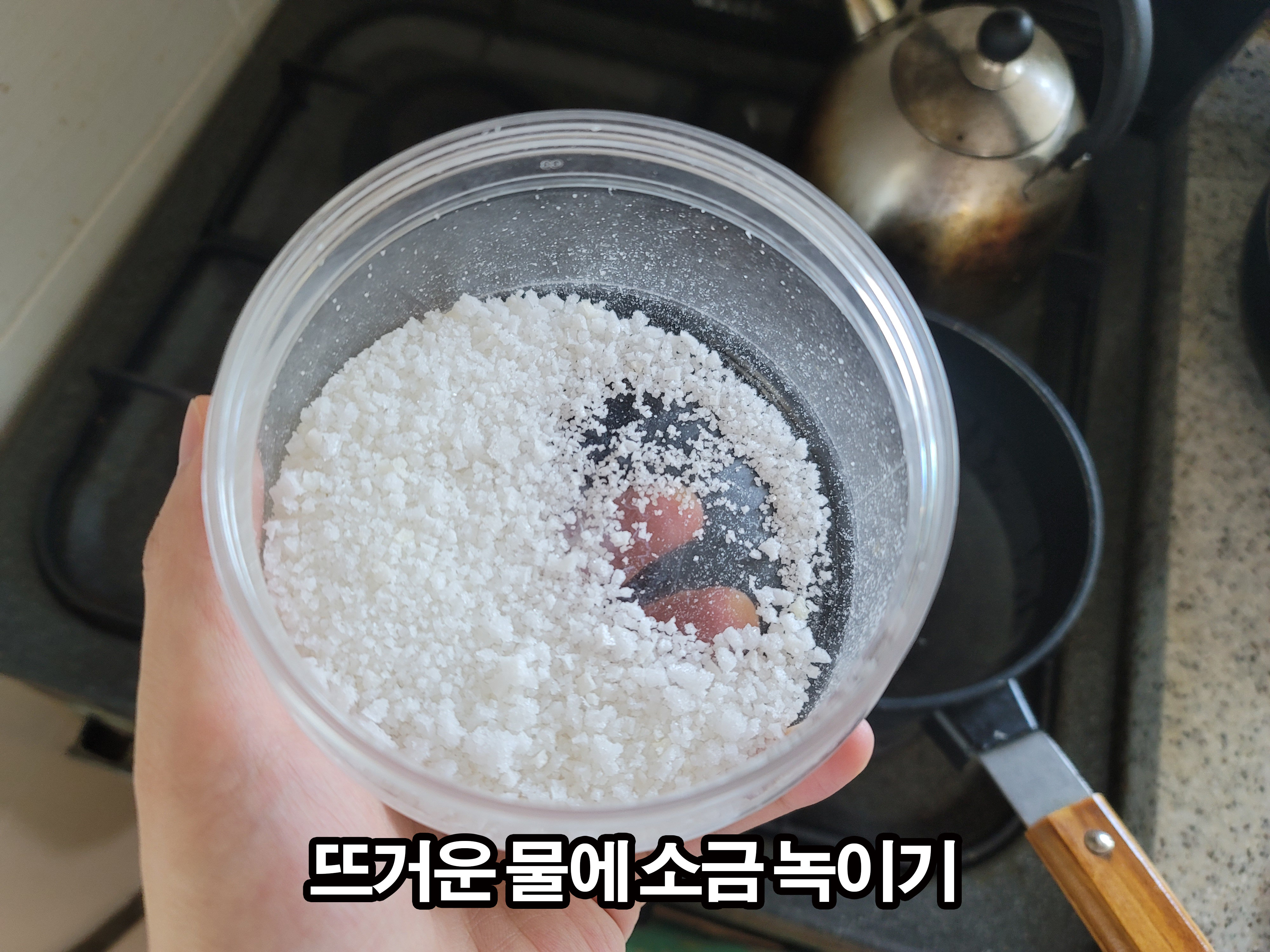 끓는 물 혹은 뜨거운 물에다가 소금을 부어서 녹여야돼요. 이 때 소금은 너무 굵으면 안되고, 적당히 얇은 소금이어야합니다. 왜냐고?? 굵으면 용해가 잘 안되니까!