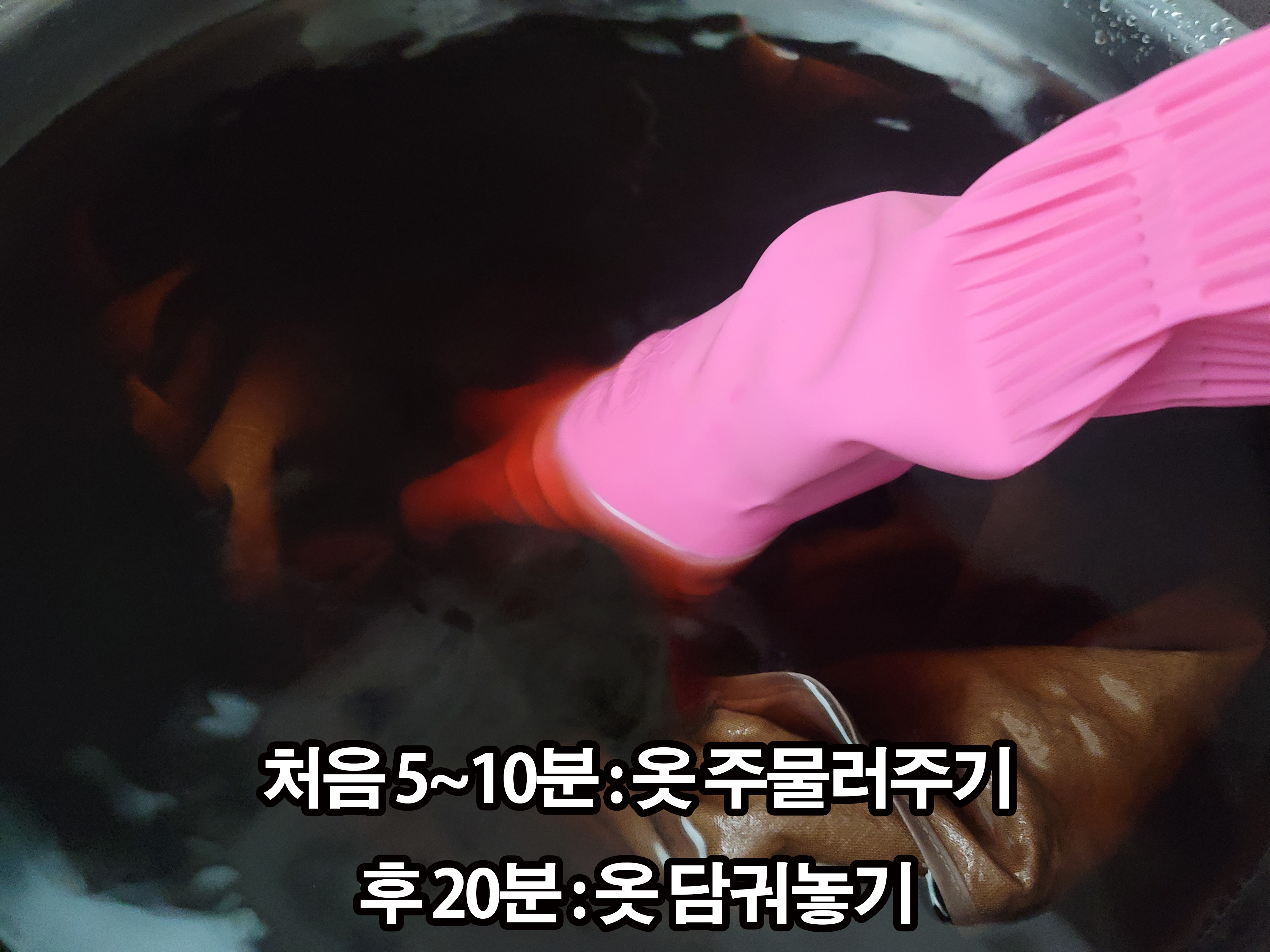 다음 옷이 폭삭 잠기게 넣어줍니다. 넣고 처음 5~10분 간은 옷을 계속 주물주물 해줘야돼요. 염색약 물이 옷에 잘 스며들 수 있도록이요. 이 과정을 대충하면 얼룩진 것마냥 어디는 염색이 잘되고, 어디는 염색이 잘 안되고 그럴 수 있습니다.