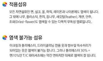 염색 가능 섬유는 모든 자연 섬유들이에요. 면이나 실크, 울, 마(린넨), 레이온, 나이론도 다 염색이 됩니다. 얘네는 자연에서 유래된 섬유니깐요. 그러나 합성섬유들 있죠. 인간이 만들어낸 아크릴과 폴리에스터 같은 재질은 염색 안됩니다.