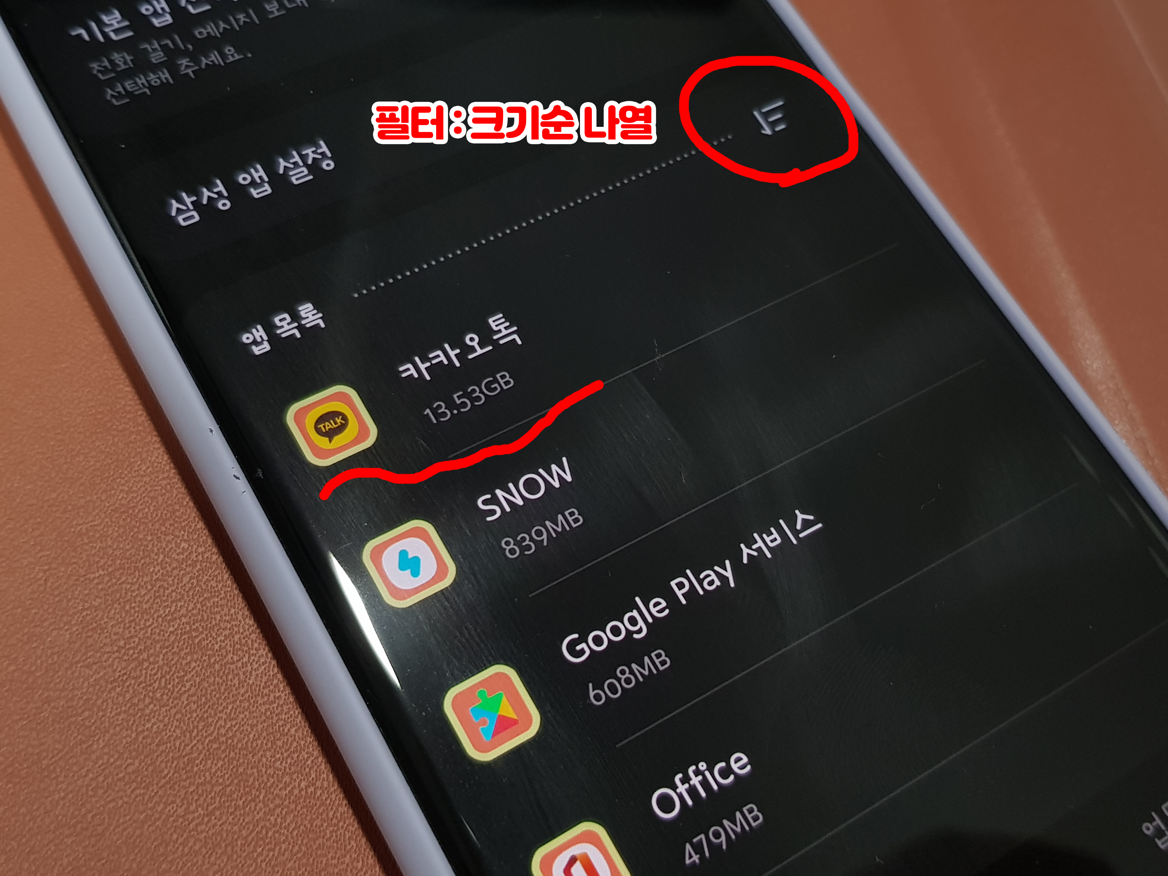 앱스를 클릭하시면 위와 같이 앱들이 뜨는데요. 오른쪽 위 필터를 클릭해서 크기순으로 나열해주세요. 약 5~10초정도 기다리면 알아서 크기순 나열되거든요.