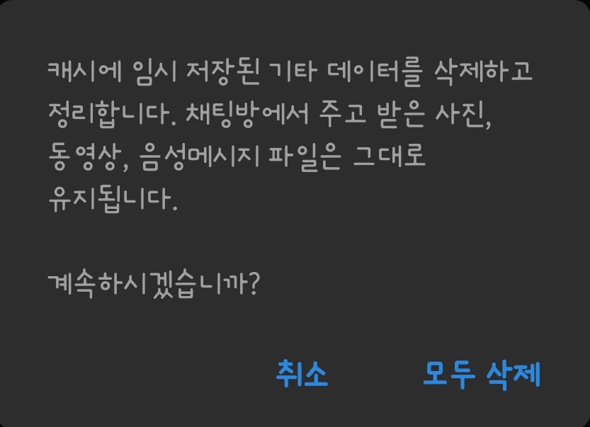 여기서 캐시 데이터 삭제 버튼을 눌러주시면 임시 저장된 기타 데이터들을 삭제할 수 있어요. 이 데이터들을 삭제하더라도 대화 내용, 사진, 동영상, 음성 메시지 파일은 삭제되지 않습니다.