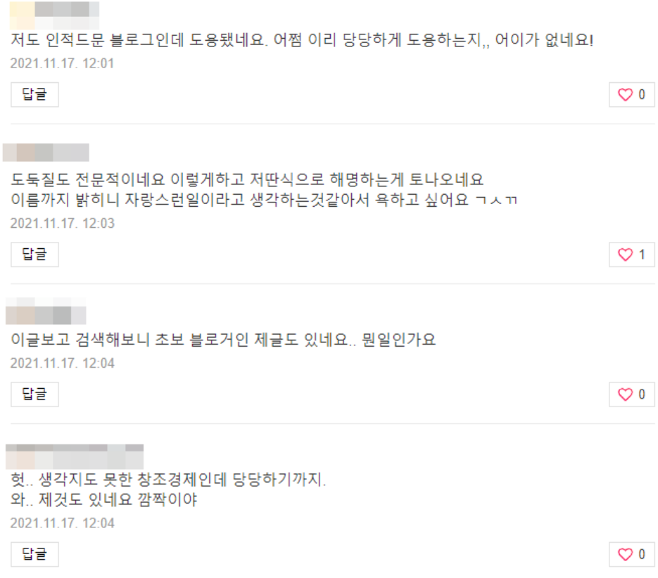 블로그 운영하는 분들이 빡쳐서 계속 글올리는 중. 네이버 측에서는 이거 대응 안하나 싶다. 자기들 수익을 저기서 가져가는데 말이야. 법적으로 고소해줬으면 한다.