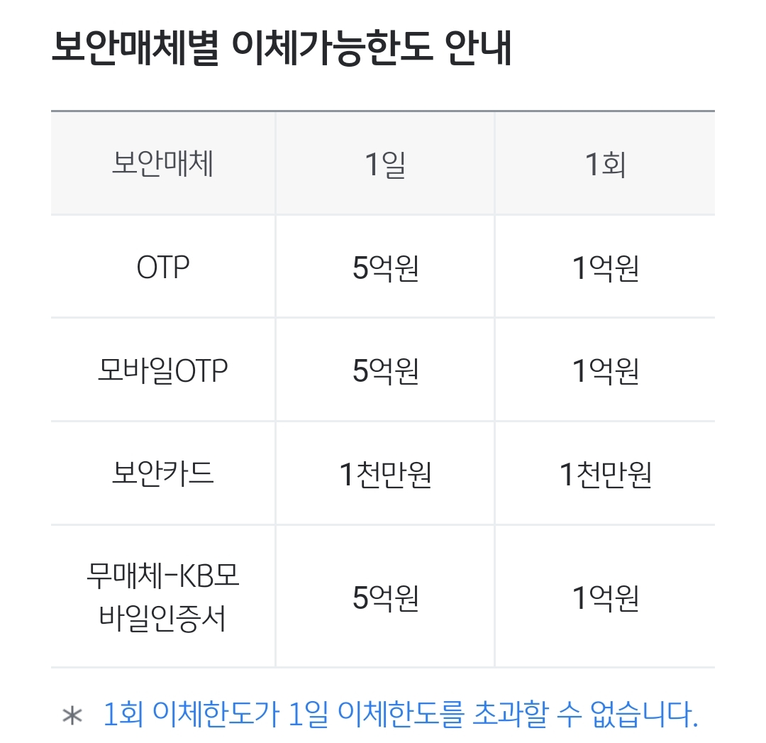 1회 1억원 1일 5억원까지 이체한도 늘릴 수 있으니 정말 편합니다. 웬만하면 앱 설치 후 KB모바일인증서 발급 추천드려요.
