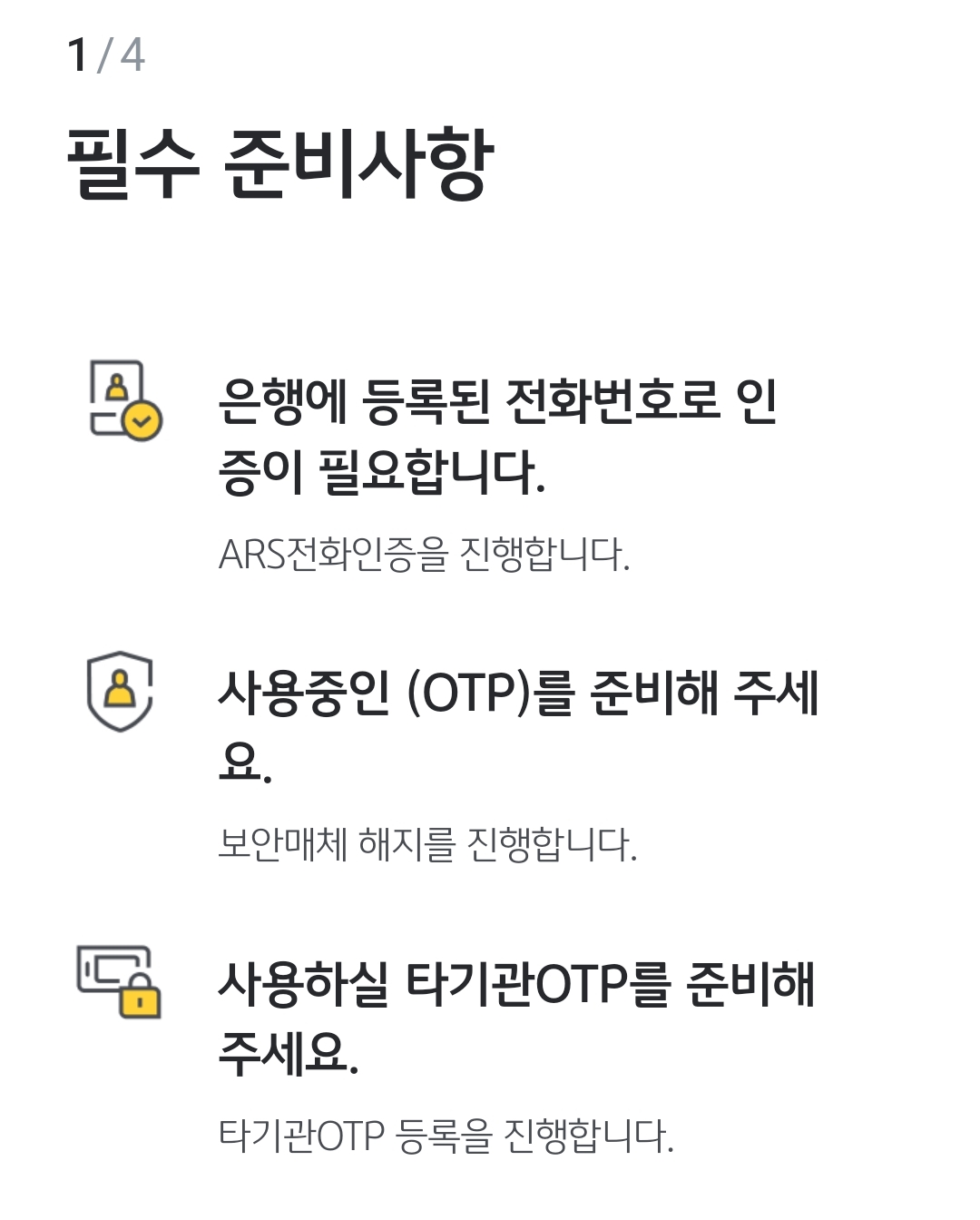 2) 타기관 포함 OTP를 보안매체로 등록하거나 KB모바일인증서를 발급받으면 됩니다.(1분이면 끝)