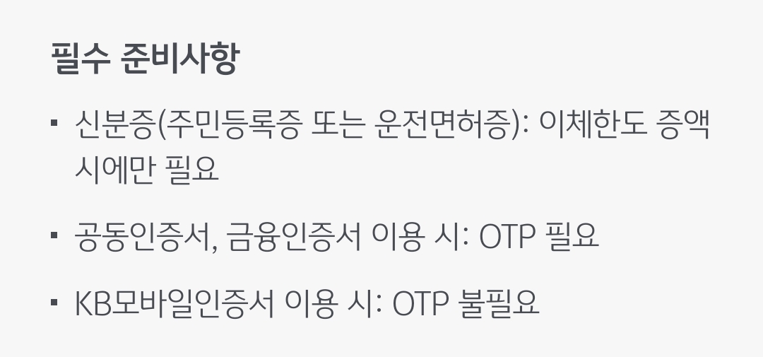 이체한도 증액을 위해서 신분증이 필요하구요. 공동인증서 + OTP로 인증하시거나 KB모바일인증서로 간단히 인증하시면 됩니다.