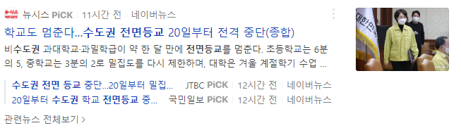 수도권 학교도 마찬가지로 20일부터 전면 등교 중단한다고 합니다. 대학의 경우 겨울 계절학기 수업은 온라인으로 진행된다고 해요.
