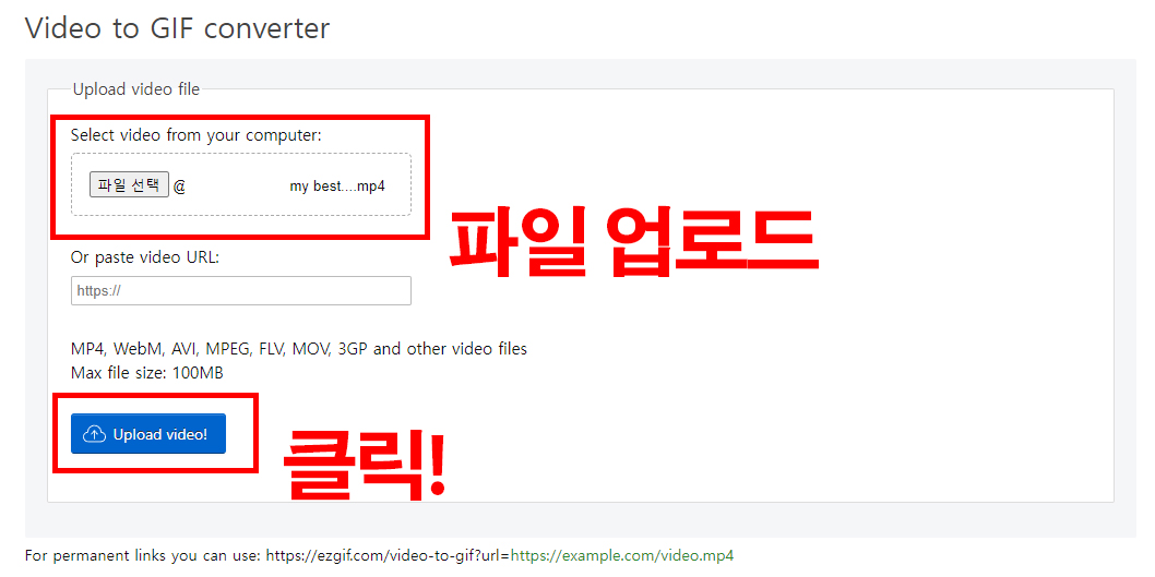ezgif라는 사이트인데, 제가 완전 애용하거든요. 여기서 파일 선택을 클릭하여 아까 다운로드 받은 움짤 mp4 파일은 업로드해주시구요.