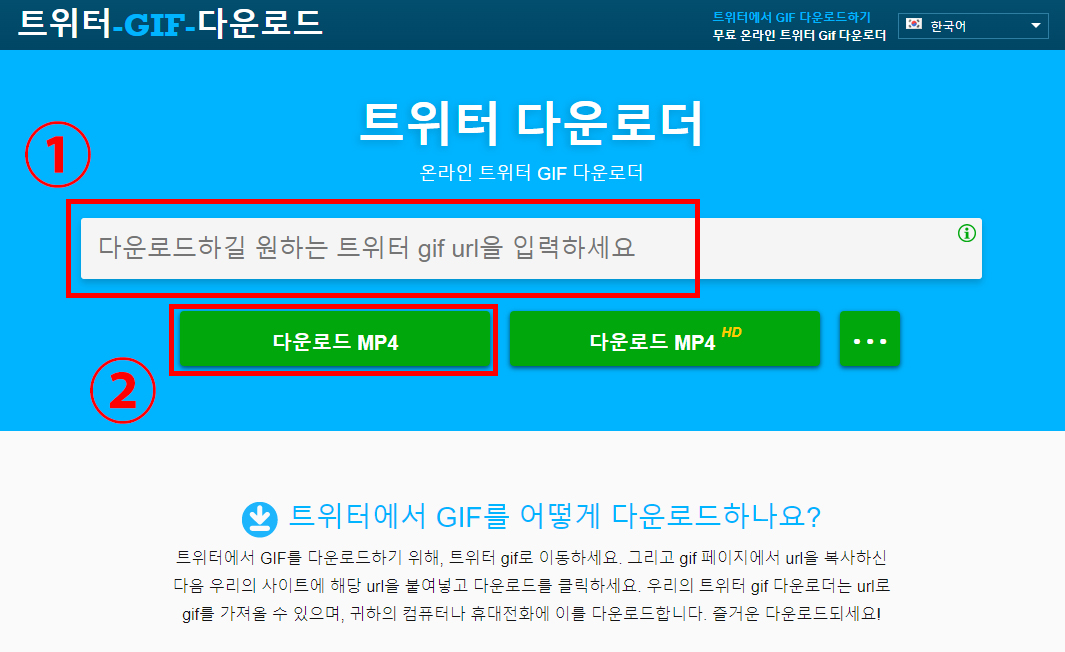 트위터 GIF 다운로더인데 아까 복사한 링크를 1번 위치에 붙여넣어줍니다. 그 다음 다운로드 MP4를 누르시면, GIF가 MP4타입으로 바뀌어서 다운받아져요. 한번에 GIF로 받아지면 좋을텐데 ㅠㅠ