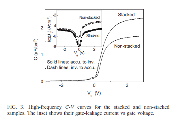 주로 이러한 CV 그래프를 통해 전기적 특성을 알아보는데 Stacked가 좋은거고 Non-stacked가 나쁜거다. Stacked는 passivation layer을 놔둔 샘플, Non-stacked 는 passivation layer을 놔두지 않은 샘플이라고 보면 된다. CV 커브는 가파를수록 좋고 C가 높을수록 좋다. 왼쪽 위 작은 그래프는 누설전류를 나타낸 그래프인데 누설전류는 낮을수록 좋다. 보면 Stacked 같은 경우 Non-stacked 보다 낮은 누설전류를 보인다. 그만큼 GeOx같은 불순물이 안생겼고 Oxide층이 자기 역할을 잘 한다는 뜻이다.