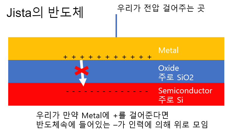 먼저 MOS 구조에 대해 간단히 알려주자면 Metal에 우리가 원하는 voltage를 걸어주고 Oxide는 전자가 흐르지 않도록 막아준다. Semiconductor은 Voltage의 양에 따라 전하가 모일수도 있고 흩어질 수도 있다. 반도체를 통해 전하를 저장하기도, 지우기도 하기 때문에 우리는 여러 제품들의 정보를 저장할수도, 지울수도 있다. USB나 컴퓨터 속에 들어있는 RAM을 생각하면 편한데 만약 전자 3개는 PPT 파일 1개와 동일하다면(사과1개 100원느낌) semiconductor에 전자 3개를 유도했을 때 USB나 RAM안에 PPT 파일 1개가 저장되는 것이다. 사과 1개가 100원의 값어치라면 100원이 있을 때 사과 한개를 언제든 구할 수 있는 것이다. 전자가 3개 있다면 우리는 그 전자의 개수를 세서 어떤 파일이 있는지 알 수 있다.