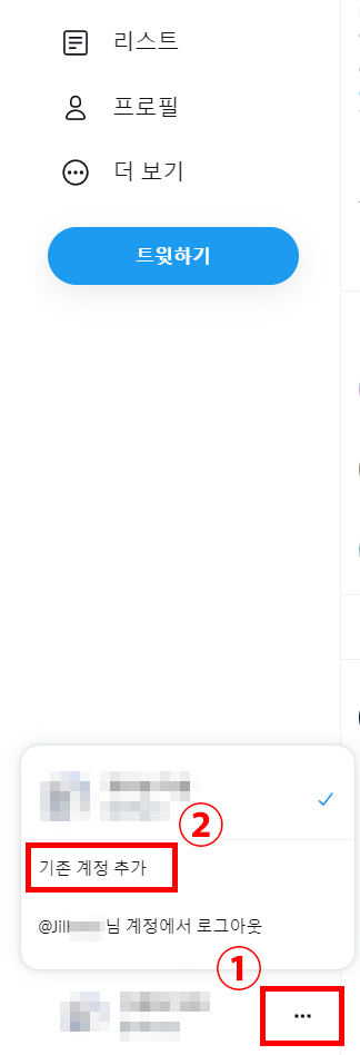 이렇게 만든 부계정들 추가하는 방법도 간단해요. 트위터 홈 왼쪽 아래 보시면 점 3개가 있는데 클릭해주시구요. 기존 계정 추가를 눌러주시면 됩니다. 아까 만든 계정 등록하심 돼요.