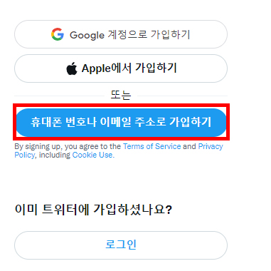 먼저 트위터 사이트 가서 휴대폰 번호나 이메일 주소로 가입하기를 선택해주세요.