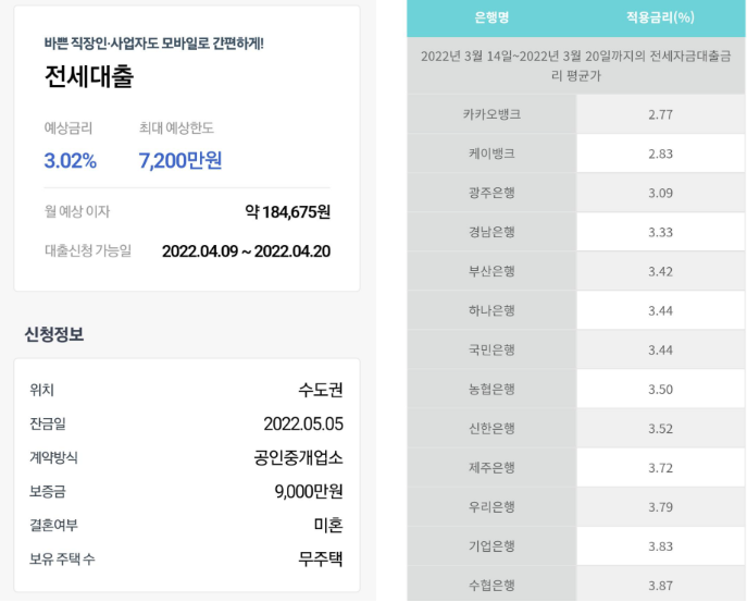 만약 청년전세대출이면 금리가 모두 일정하거나 거의 비슷할텐데 일반전세대출이라 좀 차이가 있었음. 일반전세대출은 2억2천만원까지 보증금의 80%를 대출해준다. 청년전세대출은 1억원까지 보증금의 90%를 대출해줌.