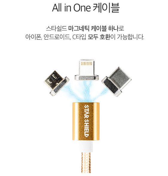 강한 자성을 통해 가까이만 가도 정확한 위치에 달라붙는 커넥터, 커넥터만 바꿔주면 어떤 핸드폰이든 충전 가능한 all in one 기능은 스타쉴드 마그네틱 고속 충전 케이블의 매력이라고 볼 수 있습니다.