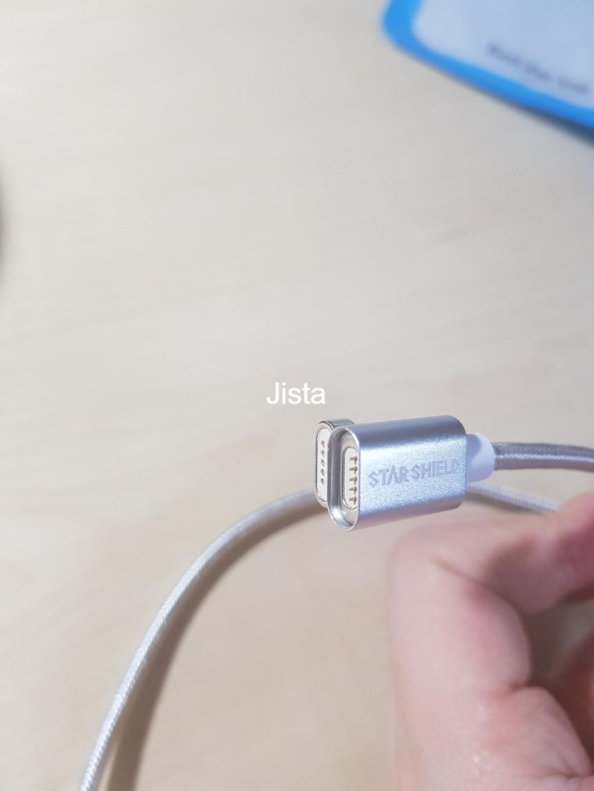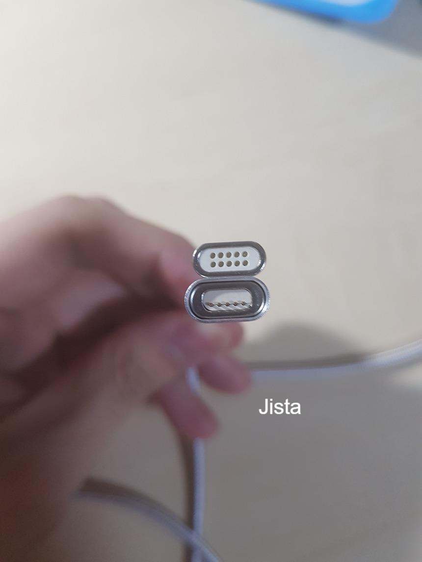 커넥터 접합부분의 사진입니다. 보시면 여기가 강한 자성을 띄고 있어서 구멍에 맞춰 딱 들어가집니다. 좀 멀리 있어도요! 스타쉴드 마그네틱 충전케이블의 장점은 자성이 강해서 자석의 힘으로 달라붙을 때 자기 위치에 딱 달라붙습니다.