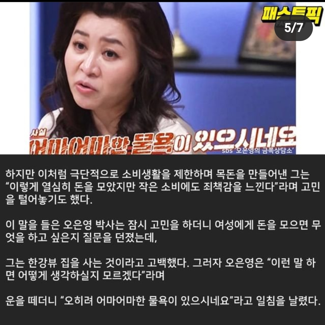 인스타보다가 발견한 사연은 한 달 생활비를 14만원으로 제한하고 한 달 중 22일이나 돈을 안썼다고 함. 또한 돈을 아끼기 위해 친구도 끊고, OTT나 5G도 사용하지 않는다고 한다. 그리고 최종 목표는 한강뷰 아파트에 사는 것.