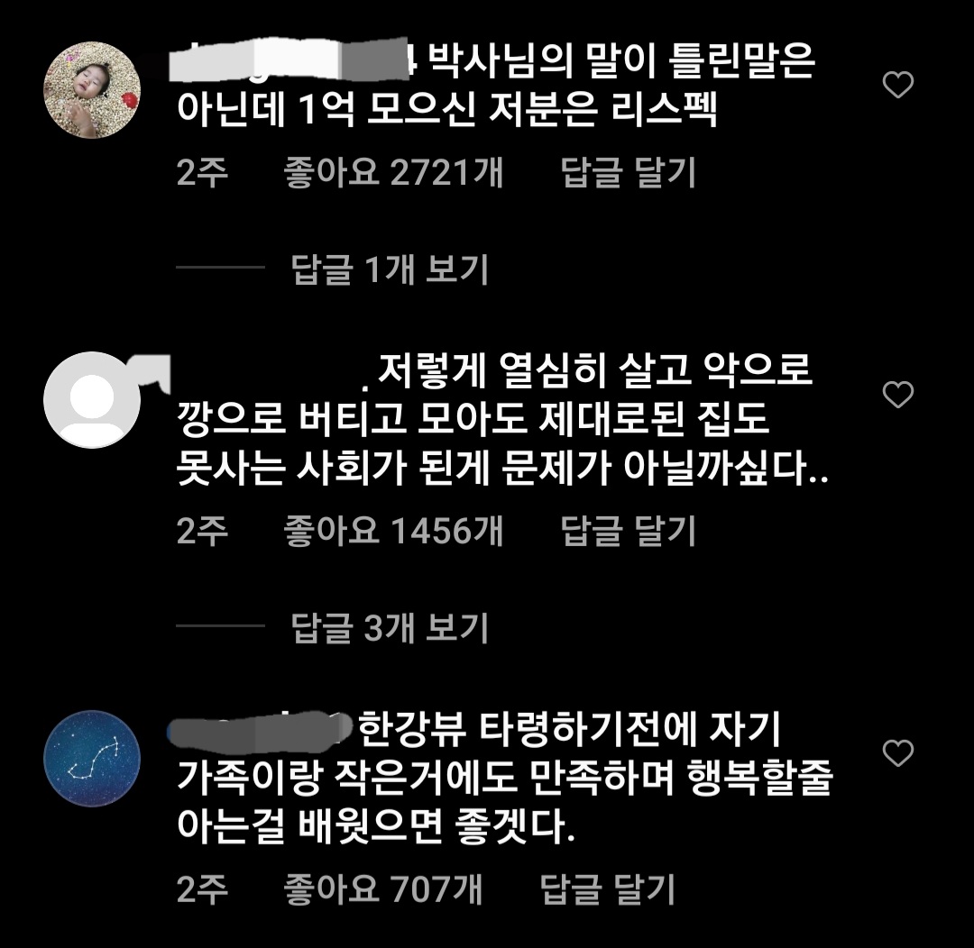 - 저렇게 열심히 살고 악으로 깡으로 버티고 모아도 제대로된 집도 못사는 사회가 된게 문제가 아닐까 싶다