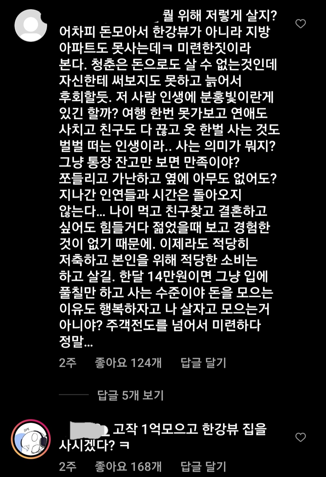 - 뭘 위해 저렇게 살지? 어차피 돈모아서 한강뷰가 아니라 지방아파트도 못사는데ㅋ 미련한짓이라 본다. 청춘은 돈으로도 살 수 없는것인데 자신한테 써보지도 못하고 늙어서 후회할듯. 저 사람 인생에 분홍빛이란게 있긴 할까? 여행 한번 못가보고 연애도 사치고 친구도 다 끊고 옷 한벌 사는 것도 벌벌 떠는 인생이라.. 사는 의미가 뭐지? 그냥 통장 잔고만 보면 만족이야? 쪼들리고 가난하고 옆에 아무도 없어도? 지나간 인연들과 시간은 돌아오지 않는다... 나이먹고 친구 찾고 결혼하고 싶어도 힘들거다 젊었을 때 보고 경험한 것이 없기 때문에. 이제라도 적당히 저축하고 본인을 위해 적당한 소비는 하고 살길. 한달 14만원이면 그냥 입에 풀칠만 하고 사는 수준이야 돈을 모으는 이유도 행복하자고 나 살자고 모으는거 아니야? 주객전도를 넘어서 미련하다 정말..